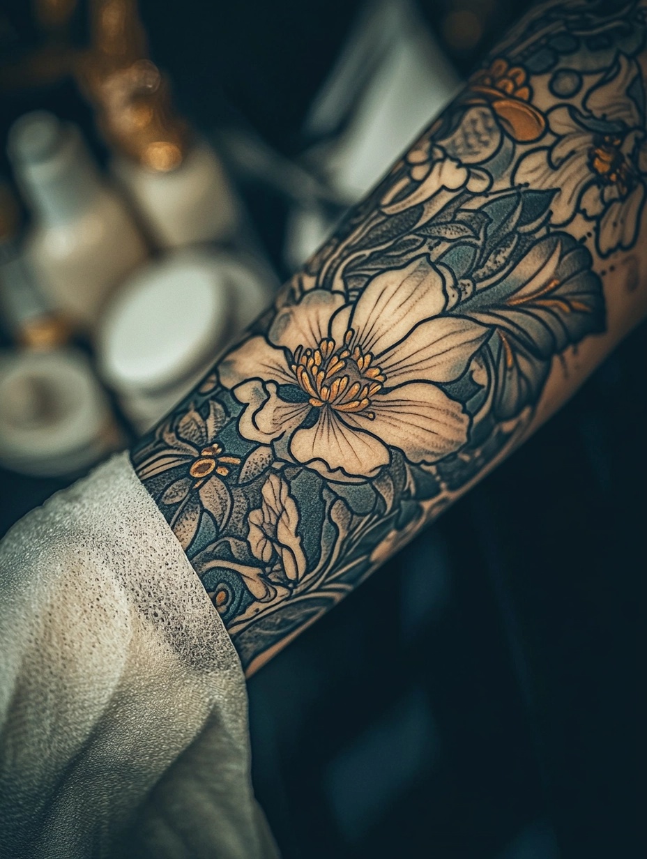 You’re bandage is acting like an artificial scab, and just like a scab it’s protecting the tattoo. That means all you have to do is leave it alone. Keep the showers cool (to mitigate the bandage wanting to peel off on it’s own), that’s all you have to do.